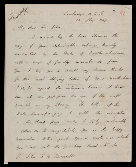 Edward Everett, Letter, from Edward Everett to Sir John Herschel, dated at Cambridge, Mass., 13 November 1847, HS/7/117, The Royal Society Archives, London, https://makingscience.royalsociety.org/items/hs_7_117/letter-from-edward-everett-to-sir-john-herschel-dated-at-cambridge-mass, accessed on 06 December 2025