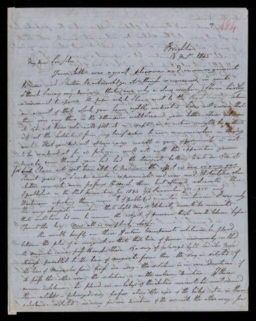 Autograph letter signed by sender. His letter was a great encouragement and pleasure. Comments on his own and John Frederick William Herschel's experiments with light and magnetism. Contemplates a further series of experiments but requests John Frederick William Herschel not to mention it. Is at Brighton for a rest.