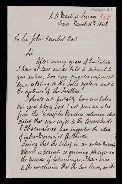 Henry P. Finlayson, Letter, from Henry P. Finlayson to Sir John Herschel, dated at Dover, 11 March 1862, HS/7/368, The Royal Society Archives, London, https://makingscience.royalsociety.org/items/hs_7_368/letter-from-henry-p-finlayson-to-sir-john-herschel-dated-at-dover, accessed on 14 December 2025