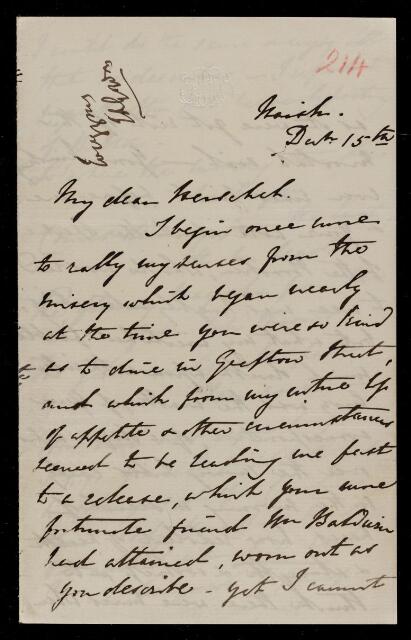 Autographed letter, incomplete. Feeling worn out with his illness. Hopes John Frederick William Herschel will be able to go to Collingwood for Christmas. Thanks for all the trouble he took over the Mint-Clark affair.