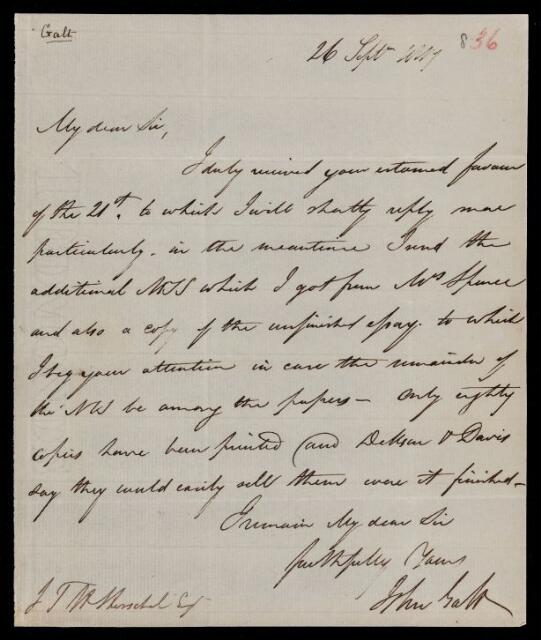 John Galt, Letter, from John Galt to Sir John Herschel, dated at Lindsey Place, Chelsea, 26 September 1817, HS/8/36, The Royal Society Archives, London, https://makingscience.royalsociety.org/items/hs_8_36/letter-from-john-galt-to-sir-john-herschel-dated-at-lindsey-place-chelsea, accessed on 17 April 2026