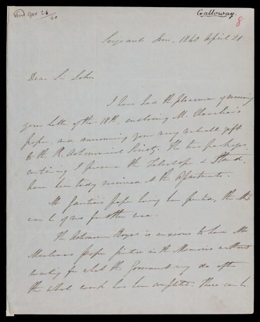 Thomas Galloway, Letter, from Thomas Galloway to Sir John Herschel, dated at Serjeants' Inn, 21 April 1840, HS/8/8, The Royal Society Archives, London, https://makingscience.royalsociety.org/items/hs_8_8/letter-from-thomas-galloway-to-sir-john-herschel-dated-at-serjeants-inn, accessed on 06 December 2025