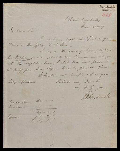 Letter, from Thomas W. Hornbuckle to Sir John Herschel, dated at St. John's College, Cambridge