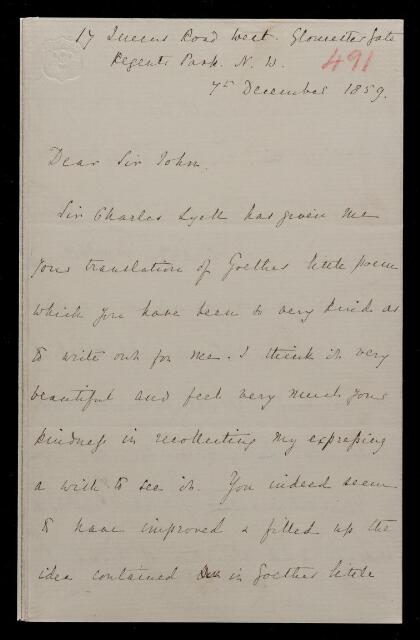 Autograph letter signed by sender. Charles Lyell has given her John Frederick William Herschel's translation of J. W. Goethe's poem. Comments on it.