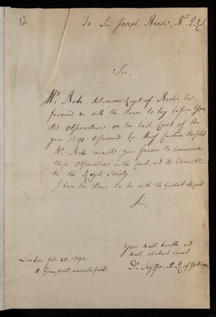 Johann Elert Bode, Caroline Lucretia Herschel, Letter, 'Observations on the comet discovered by Miss [Caroline] Herschel and its elements' from the Royal Astronomer of Gottingen to Joseph Banks with note by Johann Elert Bode, 23 February 1792, L&P/10/12, The Royal Society Archives, London, https://makingscience.royalsociety.org/items/l-and-p_10_12/letter-observations-on-the-comet-discovered-by-miss-caroline-herschel-and-its-elements-from-the-royal-astronomer-of-gottingen-to-joseph-banks-with-note-by-johann-elert-bode, accessed on 18 April 2026