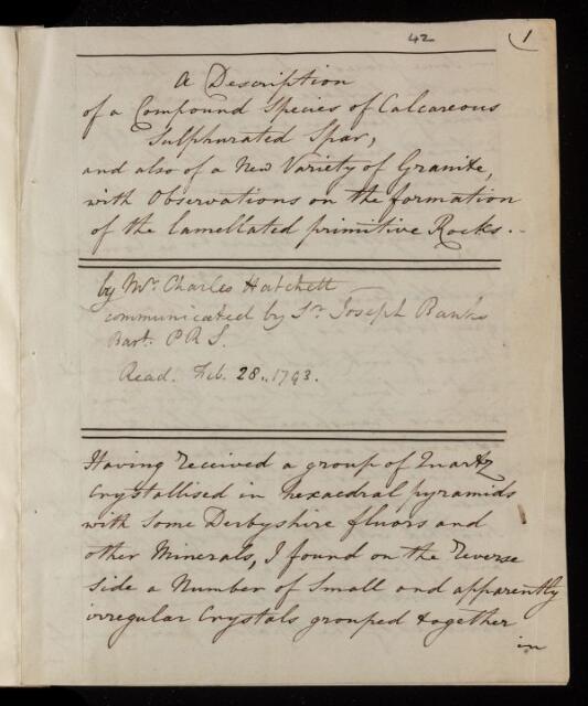 Charles Hatchett, Paper, 'Description of a compound species of calcareous sulphurated spar' by Charles Hatchett, 12 December 1792, L&P/10/42, The Royal Society Archives, London, https://makingscience.royalsociety.org/items/l-and-p_10_42/paper-description-of-a-compound-species-of-calcareous-sulphurated-spar-by-charles-hatchett, accessed on 06 December 2025