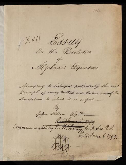 Giffin Wilson, Paper, 'An essay on the resolution of algebraic equations' by Giffin Wilson, 1799, L&P/11/104, The Royal Society Archives, London, https://makingscience.royalsociety.org/items/l-and-p_11_104/paper-an-essay-on-the-resolution-of-algebraic-equations-by-giffin-wilson, accessed on 07 March 2026