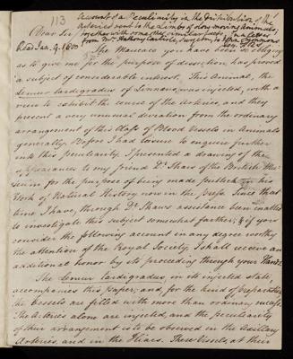 Published in Philosophical Transactions, as 'Account of a peculiarity in the distribution of the arteries sent to the limbs of slow-moving animals; together with some other similar facts. In a letter from Mr. Anthony Carlisle, surgeon, to John Symmons, Esq. F. R. S'