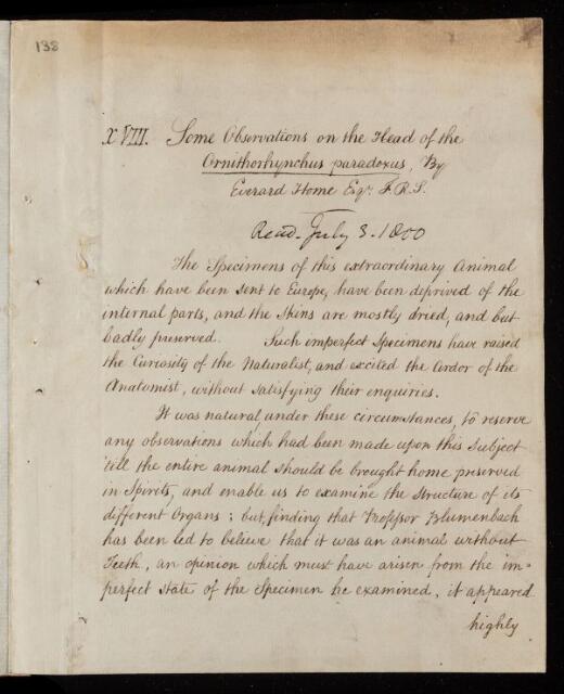 Everard Home, Paper, 'Some obervations of the head of the Ornithorhynchus paradoxus' by Everard Home, 1800, L&P/11/138, The Royal Society Archives, London, https://makingscience.royalsociety.org/items/l-and-p_11_138/paper-some-obervations-of-the-head-of-the-ornithorhynchus-paradoxus-by-everard-home, accessed on 19 January 2026