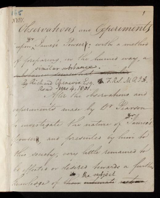 Richard Chenevix, Paper, 'Observations and experiments on Dr James' powder' by Richard Chenevix, 1801, L&P/11/165, The Royal Society Archives, London, https://makingscience.royalsociety.org/items/l-and-p_11_165/paper-observations-and-experiments-on-dr-james-powder-by-richard-chenevix, accessed on 14 November 2025