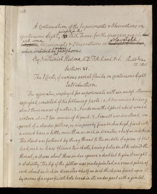 Nathaniel Hulme, Paper, 'Experiments and observations on spontaneous light' by Nathaniel Hulme, 1801, L&P/11/168, The Royal Society Archives, London, https://makingscience.royalsociety.org/items/l-and-p_11_168/paper-experiments-and-observations-on-spontaneous-light-by-nathaniel-hulme, accessed on 19 April 2026
