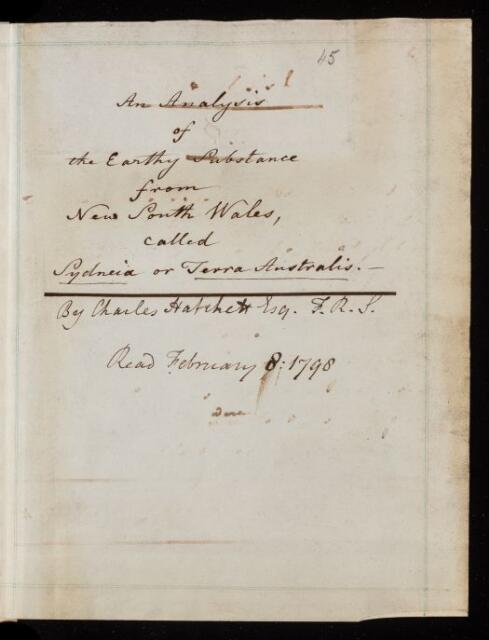Charles Hatchett, Paper, 'An analysis of the earthy substances from New South Wales, called Sydenia or Terra Australis' by Charles Hatchett, 1798, L&P/11/45, The Royal Society Archives, London, https://makingscience.royalsociety.org/items/l-and-p_11_45/paper-an-analysis-of-the-earthy-substances-from-new-south-wales-called-sydenia-or-terra-australis-by-charles-hatchett, accessed on 14 December 2025