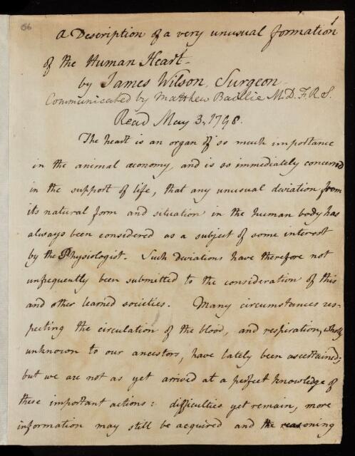 James Wilson, Paper, 'Description of a very unusual formation of the human heart' by James Wilson, 1798, L&P/11/56, The Royal Society Archives, London, https://makingscience.royalsociety.org/items/l-and-p_11_56/paper-description-of-a-very-unusual-formation-of-the-human-heart-by-james-wilson, accessed on 21 April 2026