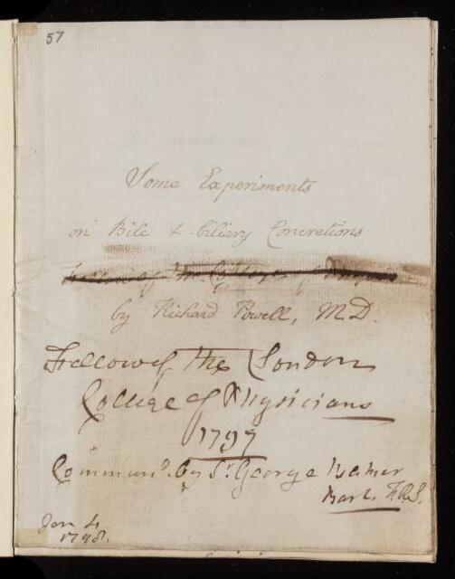 Paper, 'Experiments on bile and biliary concretions' by Richard Powell, 04 January 1798, L&P/11/57, The Royal Society Archives, London, https://makingscience.royalsociety.org/items/l-and-p_11_57/paper-experiments-on-bile-and-biliary-concretions-by-richard-powell, accessed on 07 March 2026