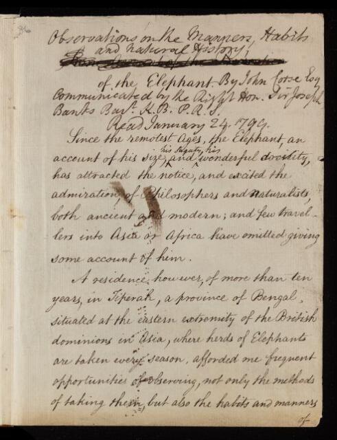 John Corse Scott, Paper, 'Observations on the manners, habits and natural history of the elephant' by John Corse, 1798, L&P/11/86, The Royal Society Archives, London, https://makingscience.royalsociety.org/items/l-and-p_11_86/paper-observations-on-the-manners-habits-and-natural-history-of-the-elephant-by-john-corse, accessed on 21 April 2026