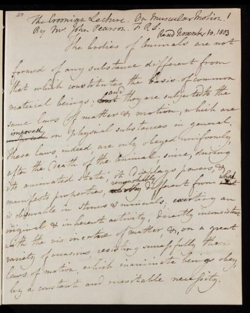 John Pearson, Paper, 'Of muscular motion' [Croonian Lecture] by John Pearson, 1803, L&P/12/59, The Royal Society Archives, London, https://makingscience.royalsociety.org/items/l-and-p_12_59/paper-of-muscular-motion-croonian-lecture-by-john-pearson, accessed on 11 November 2025