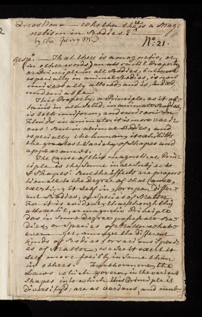 Paper, 'Whether there is a magnetism in bodies' by Charles Perry, 1742, L&P/1/102, The Royal Society Archives, London, https://makingscience.royalsociety.org/items/l-and-p_1_102/paper-whether-there-is-a-magnetism-in-bodies-by-charles-perry, accessed on 06 November 2025