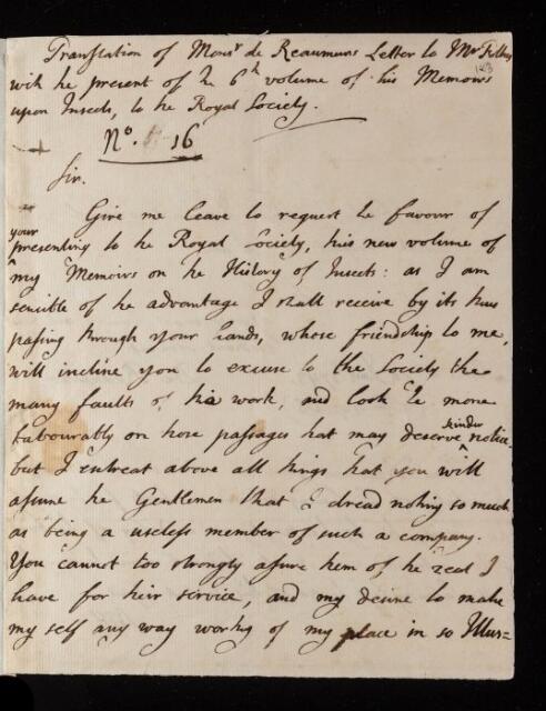 Rene-Antoine Ferchault de Reaumur, Letter, 'Gift of a copy of the 6th part of his History of Insects' from Rene-Antoine Ferchault de Reaumur to Martin Folkes, 26 January 1743, L&P/1/183, The Royal Society Archives, London, https://makingscience.royalsociety.org/items/l-and-p_1_183/letter-gift-of-a-copy-of-the-6th-part-of-his-history-of-insects-from-rene-antoine-ferchault-de-reaumur-to-martin-folkes, accessed on 11 November 2025