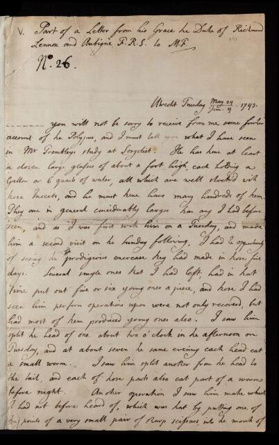 Charles Lennox, Paper, 'On Trembley's polype' from Charles Lennox, Duke of Richmond, 24 May 1743, L&P/1/191, The Royal Society Archives, London, https://makingscience.royalsociety.org/items/l-and-p_1_191/paper-on-trembleys-polype-from-charles-lennox-duke-of-richmond, accessed on 10 November 2025