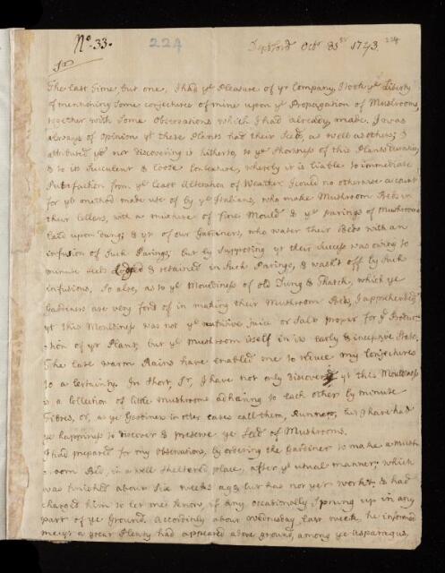 Roger Pickering, Letter, 'Of mushrooms' from Roger Pickering to Cromwell Mortimer, 03 October 1743, L&P/1/224, The Royal Society Archives, London, https://makingscience.royalsociety.org/items/l-and-p_1_224/letter-of-mushrooms-from-roger-pickering-to-cromwell-mortimer, accessed on 10 March 2026