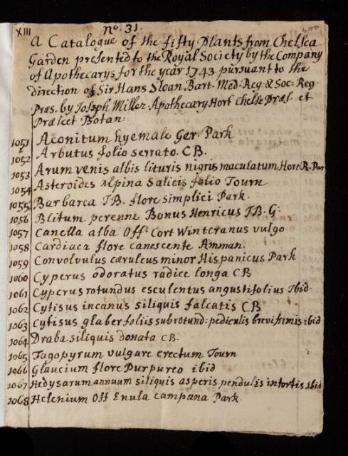 XIII. A catalogue of the fifty plants from Chelsea-Garden, presented to the Royal Society by the Company of Apothecaries, for the Year 1743. pursuant to the direction of Sir Hans Sloane, Bart. Med. Reg. & Soc. Reg. nuper Præs. By Joseph Miller, Apothecary, Hort. Chels. Præs. & Prælector Botan External link, opens in new tab.