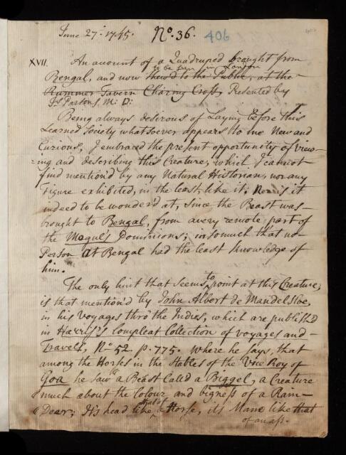 James Parsons, Paper, 'Of a quadruped brought from Bengal' by James Parsons, 27 June 1745, L&P/1/406, The Royal Society Archives, London, https://makingscience.royalsociety.org/items/l-and-p_1_406/paper-of-a-quadruped-brought-from-bengal-by-james-parsons, accessed on 17 February 2026