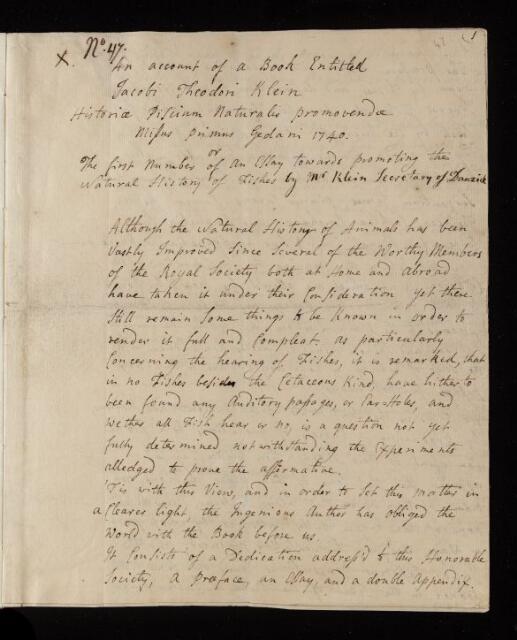 Paper, 'An account by Dr Eames of a book on the natural history of fishes' by Jacob Theodor Klein, 1741, L&P/1/47, The Royal Society Archives, London, https://makingscience.royalsociety.org/items/l-and-p_1_47/paper-an-account-by-dr-eames-of-a-book-on-the-natural-history-of-fishes-by-jacob-theodor-klein, accessed on 08 February 2026