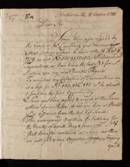 Martin Triewald, Letter, 'Concerning exchange of transactions with the Royal Society of Sweden' from Martin Triewald to Cromwell Mortimer, 12 October 1741, L&P/1/93, The Royal Society Archives, London, https://makingscience.royalsociety.org/items/l-and-p_1_93/letter-concerning-exchange-of-transactions-with-the-royal-society-of-sweden-from-martin-triewald-to-cromwell-mortimer, accessed on 11 November 2025