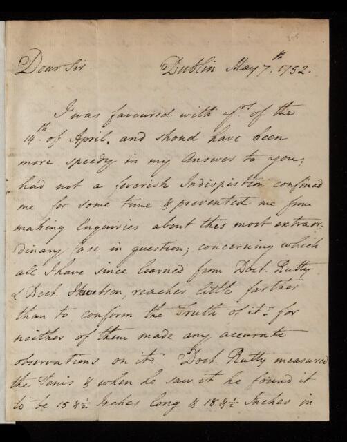 Letter, 'Of the case of enlarged penis' from Henry Quin to P C Webb, 07 May 1752, L&P/2/305, The Royal Society Archives, London, https://makingscience.royalsociety.org/items/l-and-p_2_305/letter-of-the-case-of-enlarged-penis-from-henry-quin-to-p-c-webb, accessed on 12 March 2026