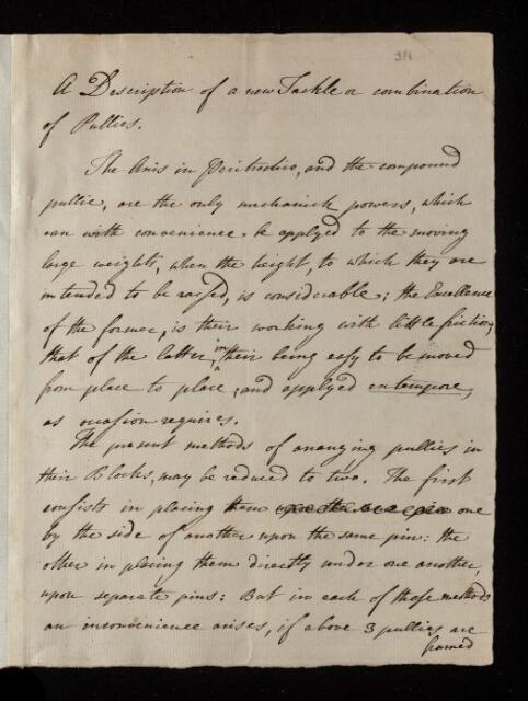 John Smeaton, Paper, 'A new tackle or combination of pullies' by John Smeaton, 1752, L&P/2/311, The Royal Society Archives, London, https://makingscience.royalsociety.org/items/l-and-p_2_311/paper-a-new-tackle-or-combination-of-pullies-by-john-smeaton, accessed on 14 February 2026