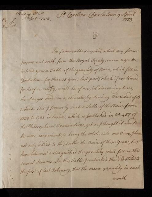 Letter, 'The rainfall at Charlestown S.C. for 15 years last past' from John Lining to Thomas Birch, 09 April 1753, L&P/2/374, The Royal Society Archives, London, https://makingscience.royalsociety.org/items/l-and-p_2_374/letter-the-rainfall-at-charlestown-sc-for-15-years-last-past-from-john-lining-to-thomas-birch, accessed on 13 November 2025