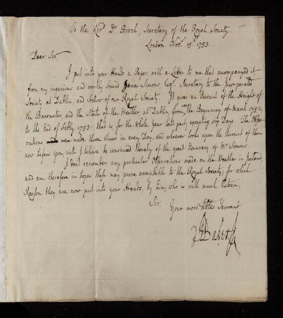 James Simon, Letter, 'Meteorological observations at Dublin' from James Simon to Thomas Birch, 15 November 1753, L&P/2/386, The Royal Society Archives, London, https://makingscience.royalsociety.org/items/l-and-p_2_386/letter-meteorological-observations-at-dublin-from-james-simon-to-thomas-birch, accessed on 15 March 2026