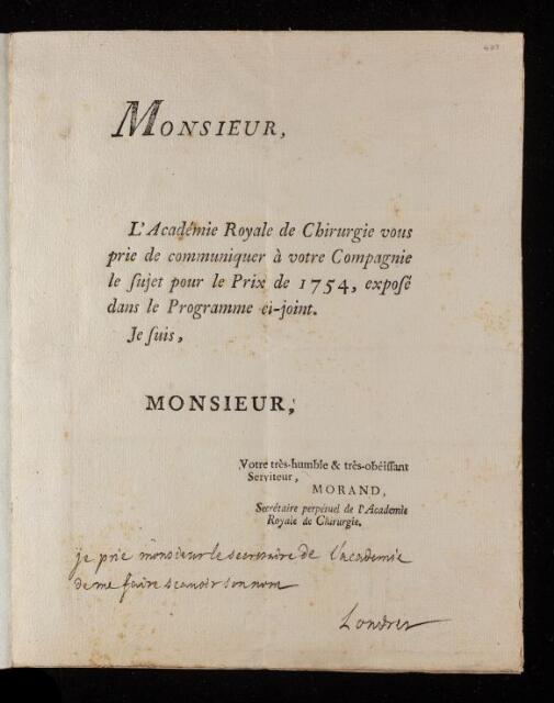 Paper, 'Prize subject for 1754' from the L'Academie Royale de Chirurgie, 1763, L&P/2/403, The Royal Society Archives, London, https://makingscience.royalsociety.org/items/l-and-p_2_403/paper-prize-subject-for-1754-from-the-lacademie-royale-de-chirurgie, accessed on 15 February 2026