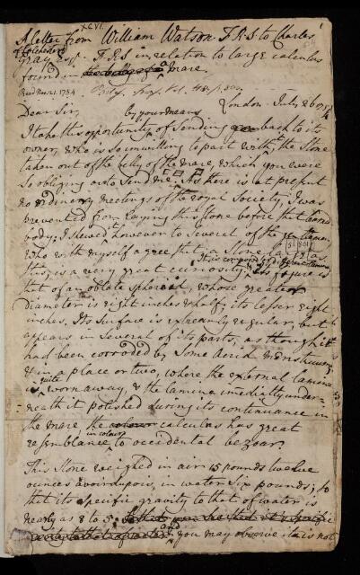 William Watson, Letter, 'Of a large calculus found in a mare' from William Watson to Charles Gray, 26 July 1754, L&P/2/534, The Royal Society Archives, London, https://makingscience.royalsociety.org/items/l-and-p_2_534/letter-of-a-large-calculus-found-in-a-mare-from-william-watson-to-charles-gray, accessed on 11 November 2025