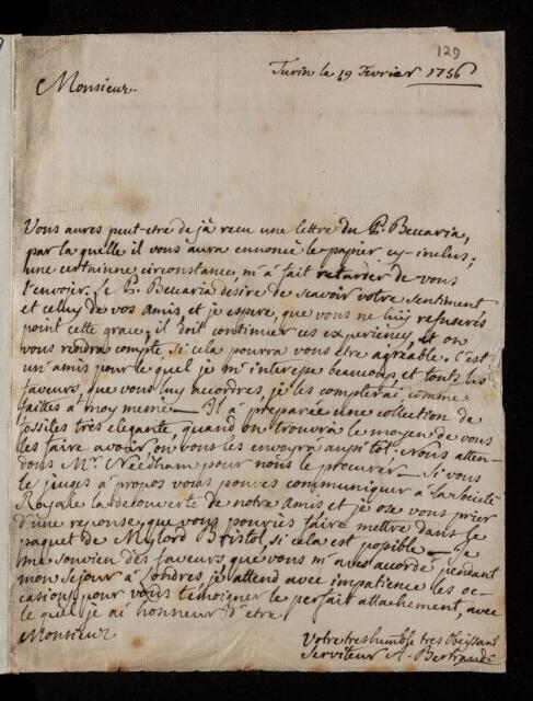 Letter, 'Concerning electrical vapour' from A Bertrand to James Parsons, 19 February 1756, L&P/3/129, The Royal Society Archives, London, https://makingscience.royalsociety.org/items/l-and-p_3_129/letter-concerning-electrical-vapour-from-a-bertrand-to-james-parsons, accessed on 14 November 2025