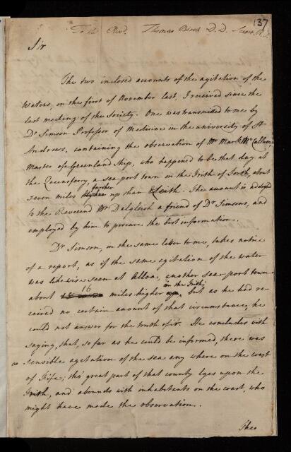 Letter, 'Agitation of water at Queensferry, Nov 1, and of chandeliers in Hamburgh churches (the latter by Reymarus)' from Mark McCallum
