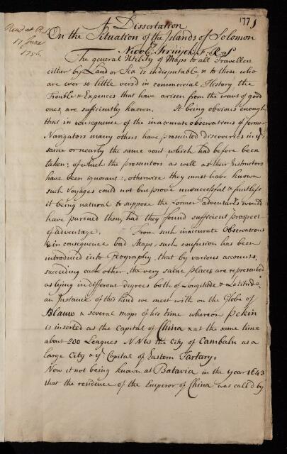 Nicholas Struyck, Paper, 'Of the situation of the islands of Solomon' by Nicholas Struyck, 1756, L&P/3/177, The Royal Society Archives, London, https://makingscience.royalsociety.org/items/l-and-p_3_177/paper-of-the-situation-of-the-islands-of-solomon-by-nicholas-struyck, accessed on 11 April 2026