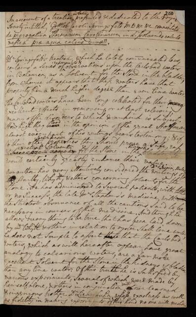 William Watson, Paper, 'Account of Gottlob Carl Springsfeld's Latin treatise sent to the Royal Society on dissolving calculi in the bladder; Carldbad water' by William Watson, 1756, L&P/3/200, The Royal Society Archives, London, https://makingscience.royalsociety.org/items/l-and-p_3_200/paper-account-of-gottlob-carl-springsfelds-latin-treatise-sent-to-the-royal-society-on-dissolving-calculi-in-the-bladder-carldbad-water-by-william-watson, accessed on 08 February 2026