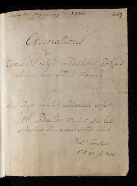 Job Baster, Paper, 'Of corallines and other marine animals' by Job Baster, 1757, L&P/3/247, The Royal Society Archives, London, https://makingscience.royalsociety.org/items/l-and-p_3_247/paper-of-corallines-and-other-marine-animals-by-job-baster, accessed on 11 November 2025