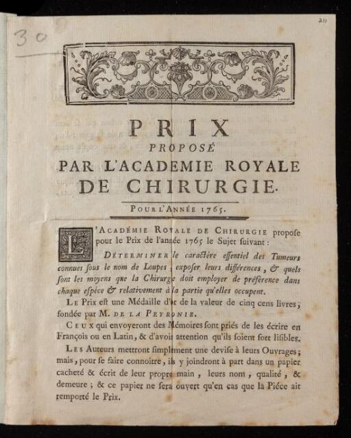 Pamphlet, 'The prize for 1765' from the Royal Academy of Surgery, Paris, 1764, L&P/4/211, The Royal Society Archives, London, https://makingscience.royalsociety.org/items/l-and-p_4_211/pamphlet-the-prize-for-1765-from-the-royal-academy-of-surgery-paris, accessed on 21 January 2026