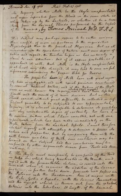 Thomas Percival, Paper, 'Formation of milk' by Thomas Percival, 17 December 1765, L&P/4/305, The Royal Society Archives, London, https://makingscience.royalsociety.org/items/l-and-p_4_305/paper-formation-of-milk-by-thomas-percival, accessed on 13 March 2026