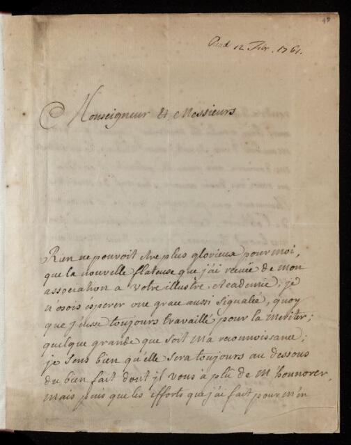 Letter, 'Thanks for election as FRS [Fellow of the Royal Society]' from Jean Joseph Le Sue