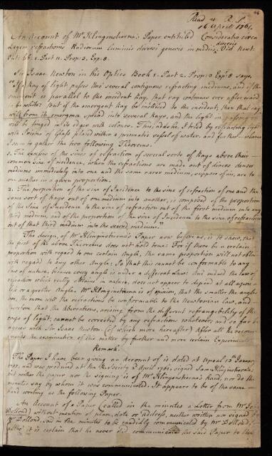 Robert More, Paper, 'An account of Klingenstierna's paper' by Robert More, 16 April 1761, L&P/4/66, The Royal Society Archives, London, https://makingscience.royalsociety.org/items/l-and-p_4_66/paper-an-account-of-klingenstiernas-paper-by-robert-more, accessed on 17 November 2025