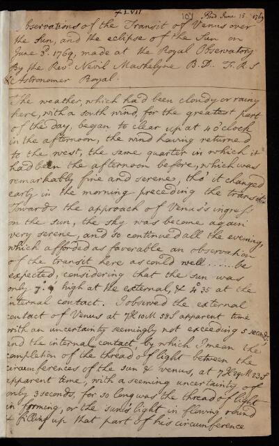 Nevil Maskelyne, Paper, 'The transit of Venus and the solar sclipse of 3 June' by Nevil Maskelyne, 1769, L&P/5/107, The Royal Society Archives, London, https://makingscience.royalsociety.org/items/l-and-p_5_107/paper-the-transit-of-venus-and-the-solar-sclipse-of-3-june-by-nevil-maskelyne, accessed on 13 November 2025