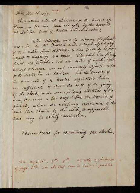 Paper, 'Of the transit of Venus as observed at Norton near Leicester' by William Ludlam, 1769, L&P/5/121, The Royal Society Archives, London, https://makingscience.royalsociety.org/items/l-and-p_5_121/paper-of-the-transit-of-venus-as-observed-at-norton-near-leicester-by-william-ludlam, accessed on 13 November 2025