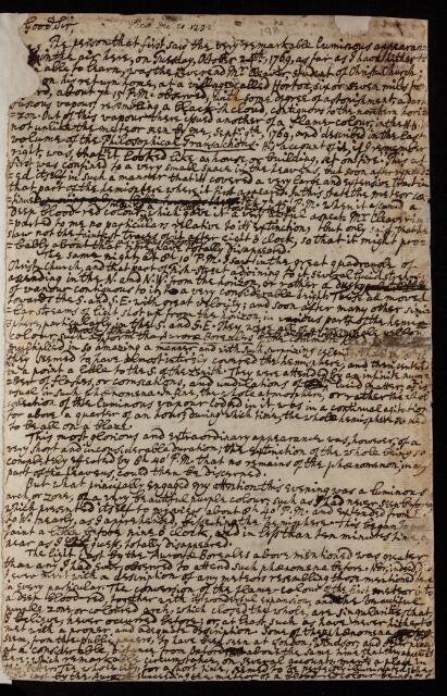 Published in Philosophical Transactions, as 'An account of a very remarkable meteor seen at Oxford. In a letter to Mathew Maty, M. D. Sec. R. S. from the Rev. John Swinton, B. D. F. R. S. Custos Archivorum of the University of Oxford, Member of the Academy degli Apatisti at Florence, and of the Etruscan Academy of Cortona in Tuscany'