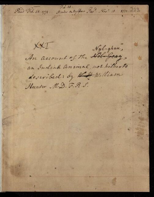 William Hunter, Paper, 'The nyl-gau, an Indian animal' by William Hunter, 1771, L&P/5/223, The Royal Society Archives, London, https://makingscience.royalsociety.org/items/l-and-p_5_223/paper-the-nyl-gau-an-indian-animal-by-william-hunter, accessed on 11 February 2026