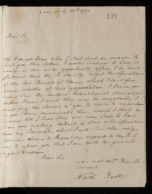 Nathaniel Pigott, Paper, 'Meteorological observations at Caen in the years 1765-69' by Nathaniel Piggott, 20 July 1770, L&P/5/237, The Royal Society Archives, London, https://makingscience.royalsociety.org/items/l-and-p_5_237/paper-meteorological-observations-at-caen-in-the-years-1765-69-by-nathaniel-piggott, accessed on 15 December 2025