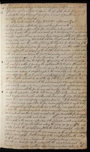 Nevil Maskelyne, Paper, 'Remarks on Hadley's quadrant' by Nevil Maskelyne, 1772, L&P/5/306, The Royal Society Archives, London, https://makingscience.royalsociety.org/items/l-and-p_5_306/paper-remarks-on-hadleys-quadrant-by-nevil-maskelyne, accessed on 16 November 2025
