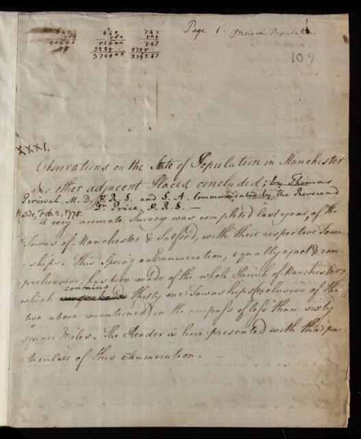 Thomas Percival, Paper, 'The population of Manchester' by Thomas Percival, 01 July 1774, L&P/6/109, The Royal Society Archives, London, https://makingscience.royalsociety.org/items/l-and-p_6_109/paper-the-population-of-manchester-by-thomas-percival, accessed on 06 December 2025